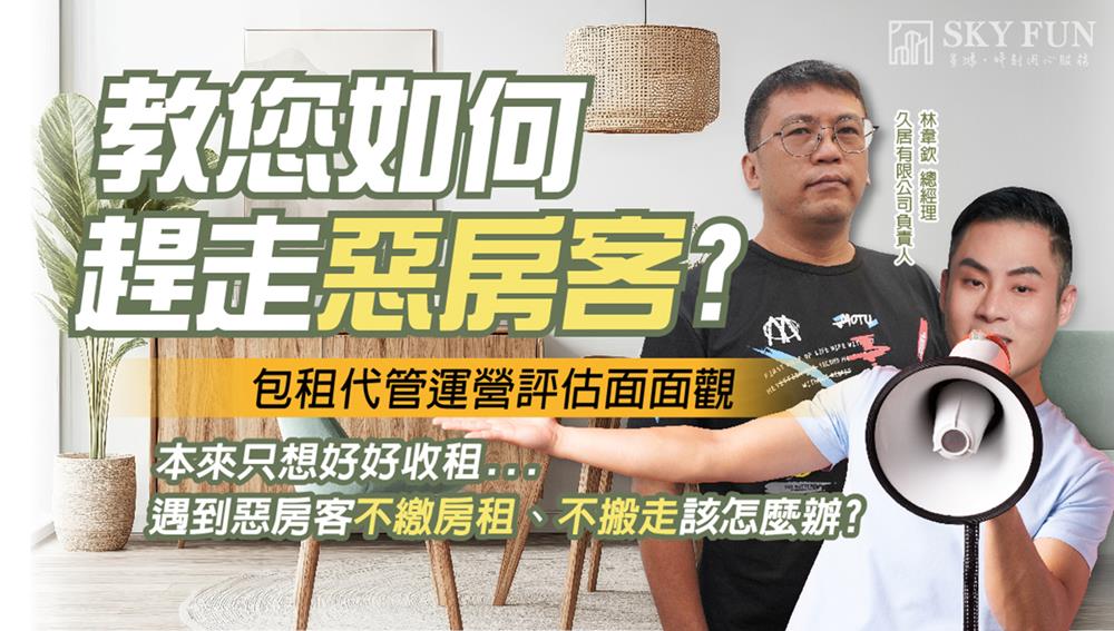 講座亮點:身為房東,常常有相同的擔憂︰努力奮鬥買來的房子,想好好管理收租,但最怕遇到不良房客,收不到租金又趕不走。有時不良房客的影響動輒1-2年才能解決,光租金損失,可能上看幾十到上百萬。本次邀請到包租管理經驗豐富的久居–林韋欽總經理,來跟您分享有關招租、房客評估、不良房客處理的經驗,提供各位房東寶貴的出租技巧。