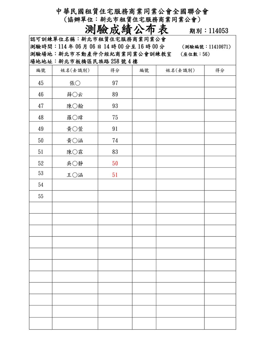 (新訓一班)114年6月份【租賃住宅管理人員專業訓練班】測驗成績單