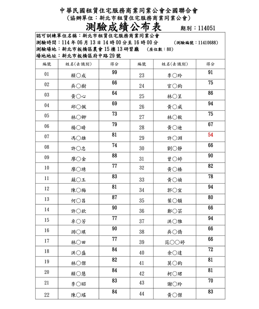 (新訓二班)114年6月份【租賃住宅管理人員專業訓練班】測驗成績單