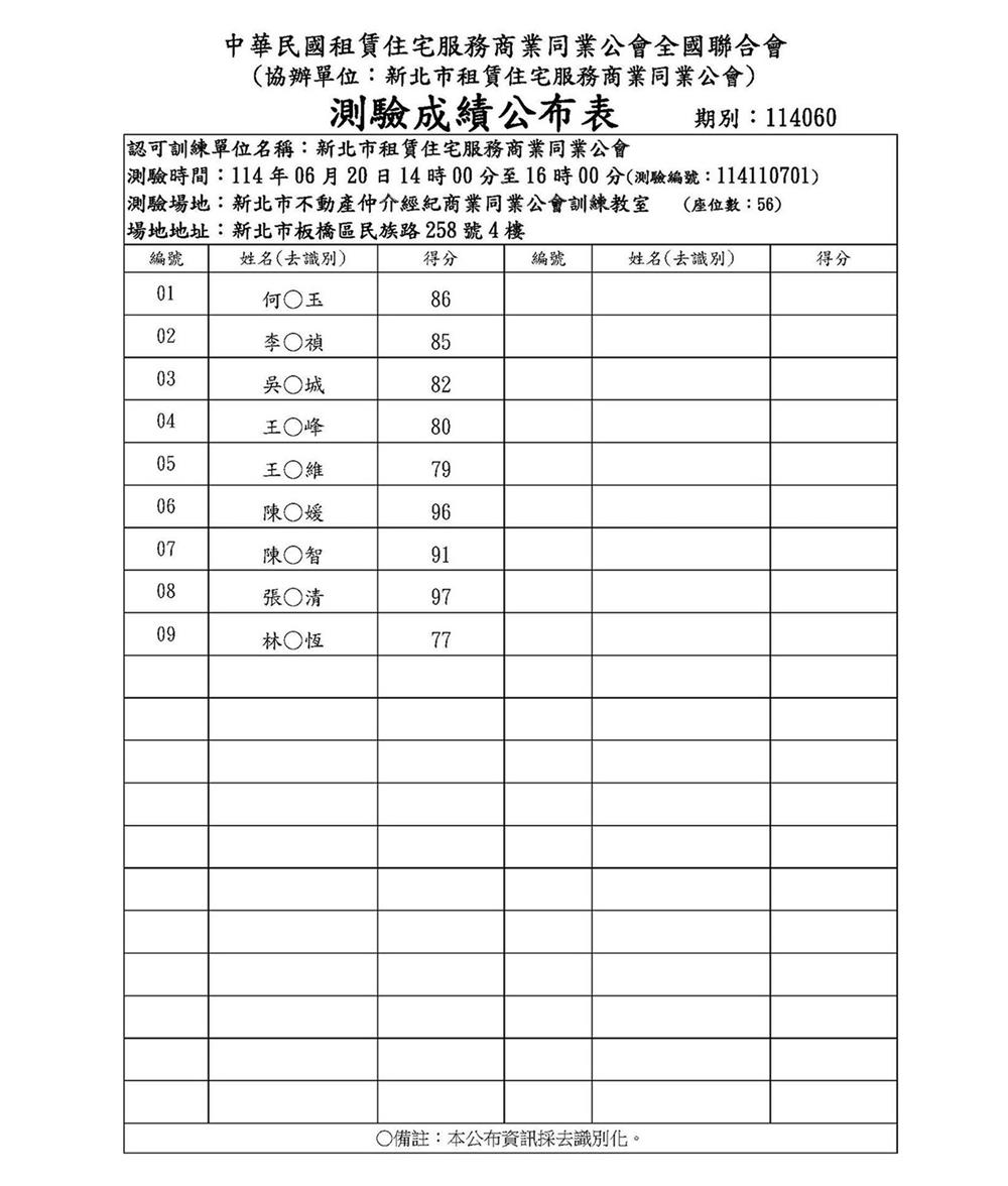(換證班)114年6月份【租賃住宅管理人員換證訓練與測驗】成績公布