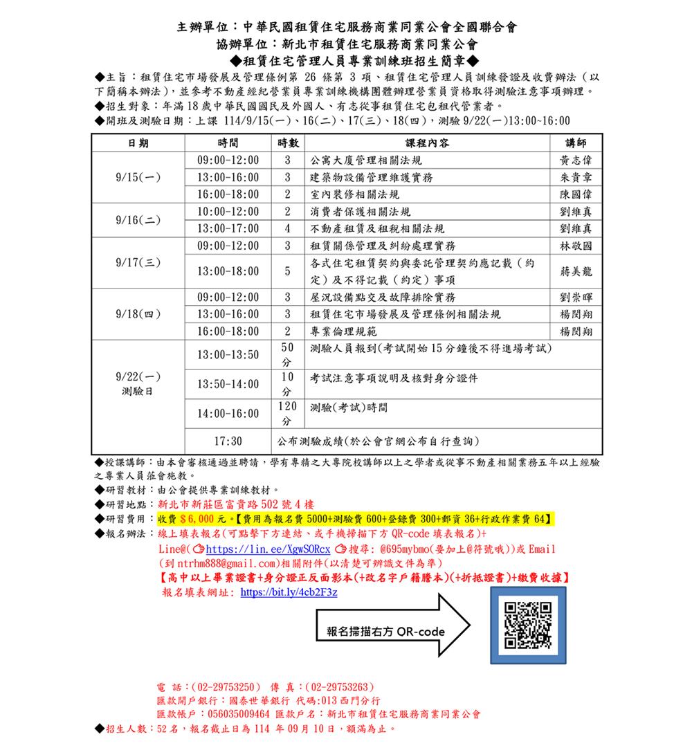 (新訓二班)114年9月份【租賃住宅管理人員專業訓練班】報名簡章