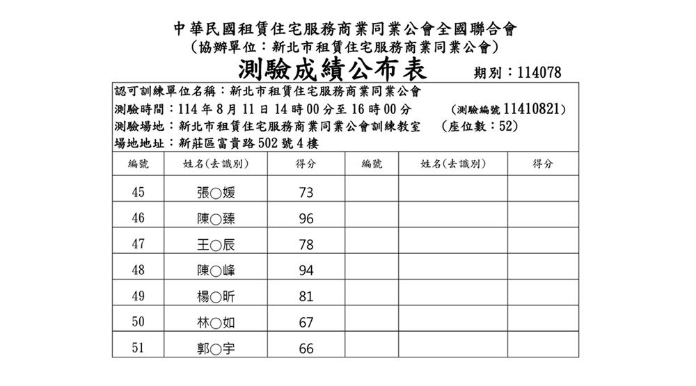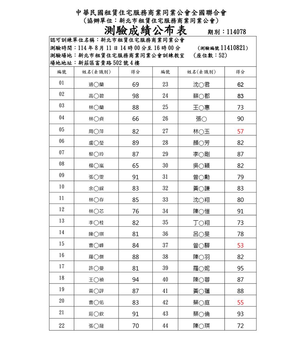 (新訓一班)114年8月份【租賃住宅管理人員專業訓練班】測驗成績單