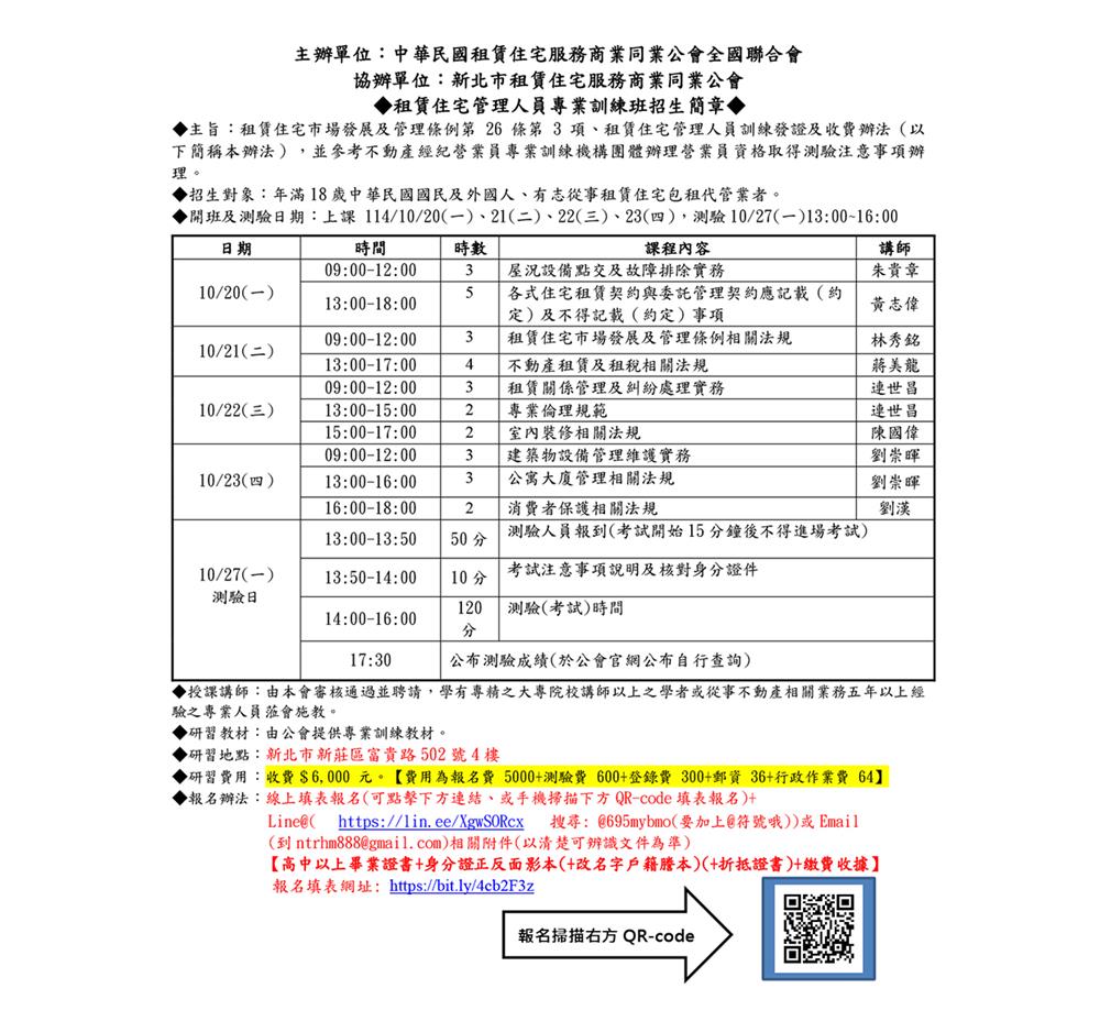 (新訓二班)114年10月份【租賃住宅管理人員專業訓練班】報名簡章