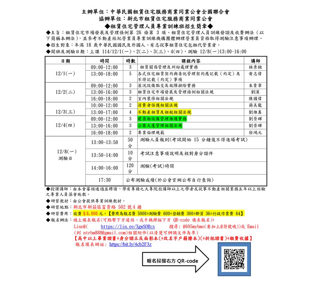(新訓一班)114年12月份【租賃住宅管理人員專業訓練班】報名簡章