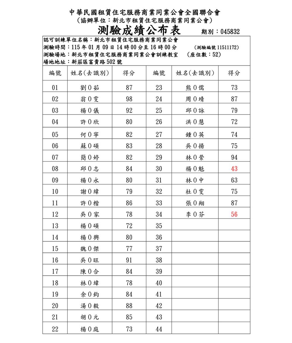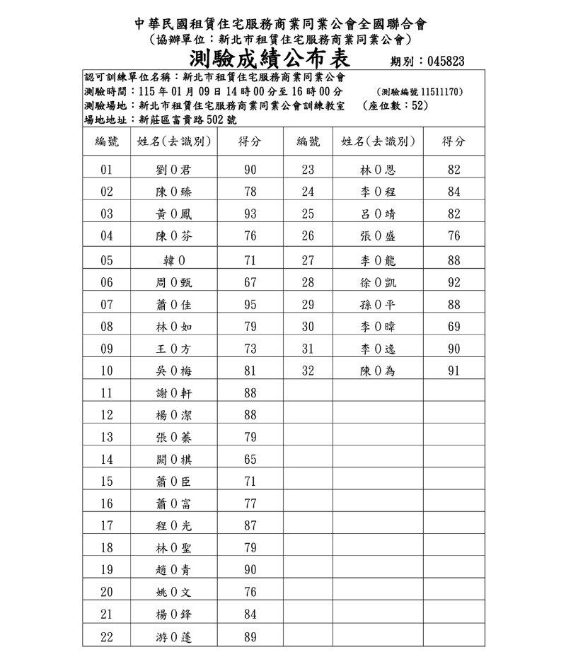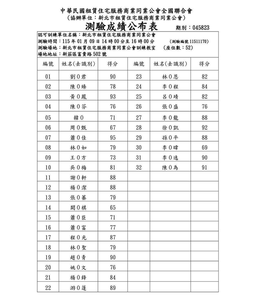 (新訓一B班)115年1月份【租賃住宅管理人員專業訓練班】測驗成績單