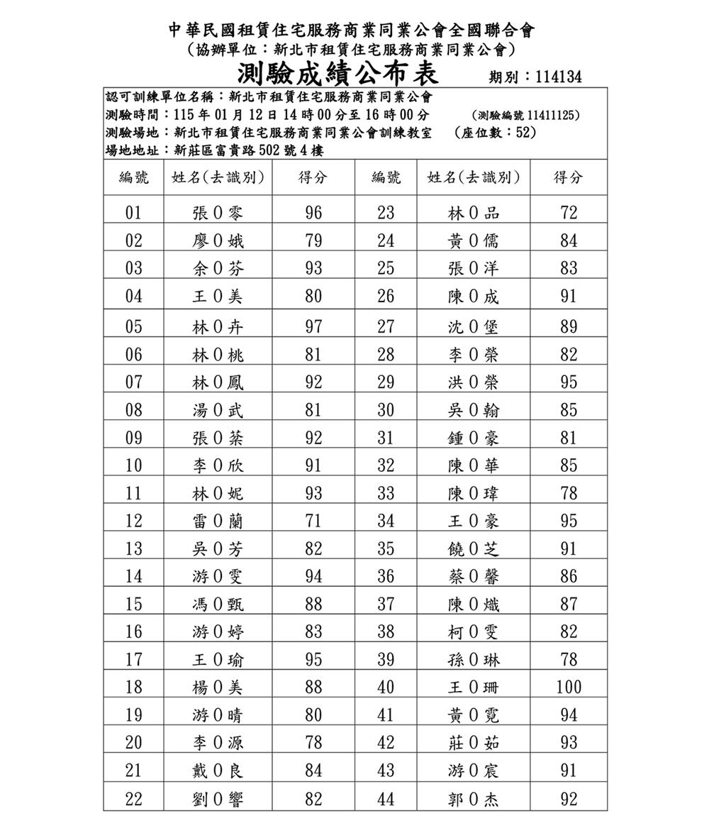 (新訓一A班)115年1月份【租賃住宅管理人員專業訓練班】測驗成績單