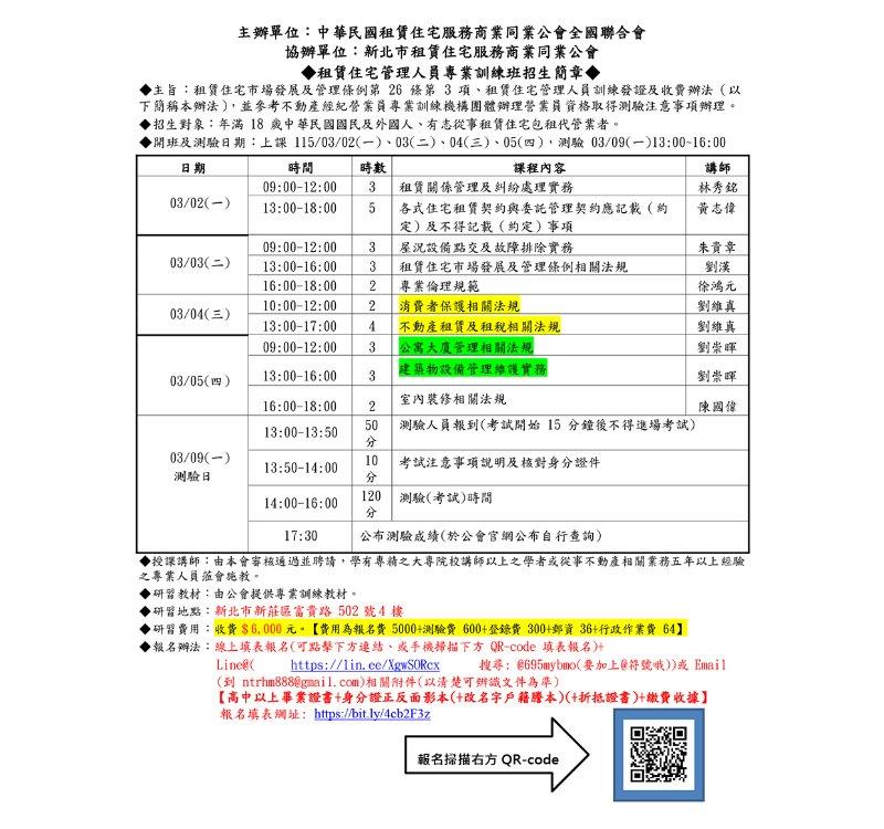 (新訓一班)115年03月份【租賃住宅管理人員專業訓練班】報名簡章