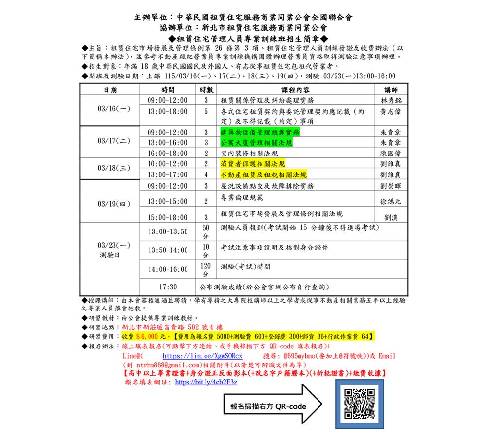 (新訓二班)115年03月份【租賃住宅管理人員專業訓練班】報名簡章