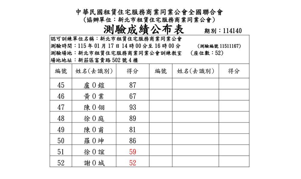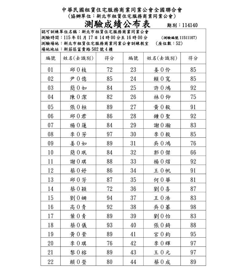 (假日班)115年1月份【租賃住宅管理人員專業訓練班】測驗成績單