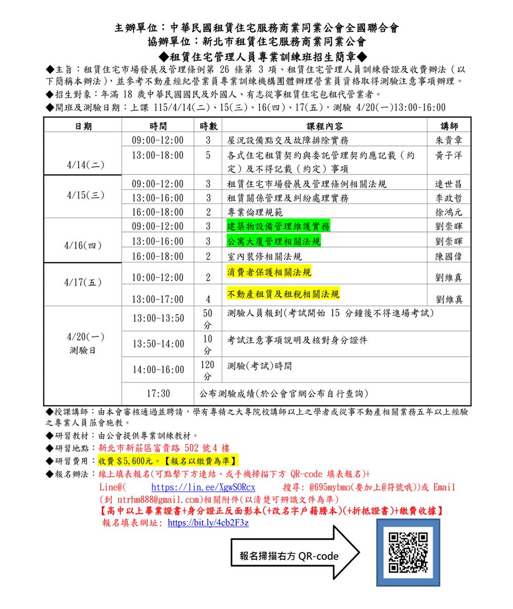 (新訓二班)115年04月份【租賃住宅管理人員專業訓練班】報名簡章