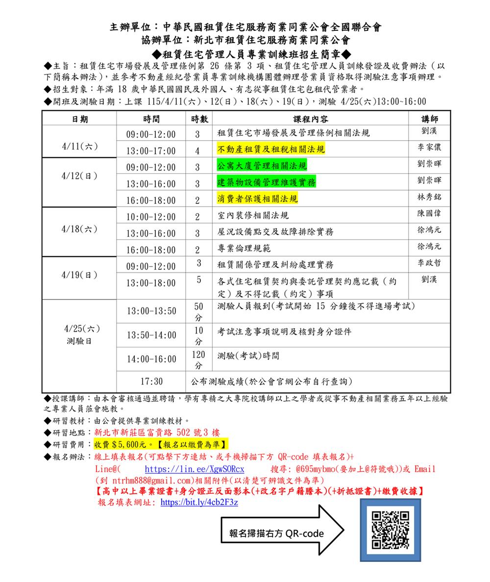 (假日班)115年04月份【租賃住宅管理人員專業訓練班】報名簡章