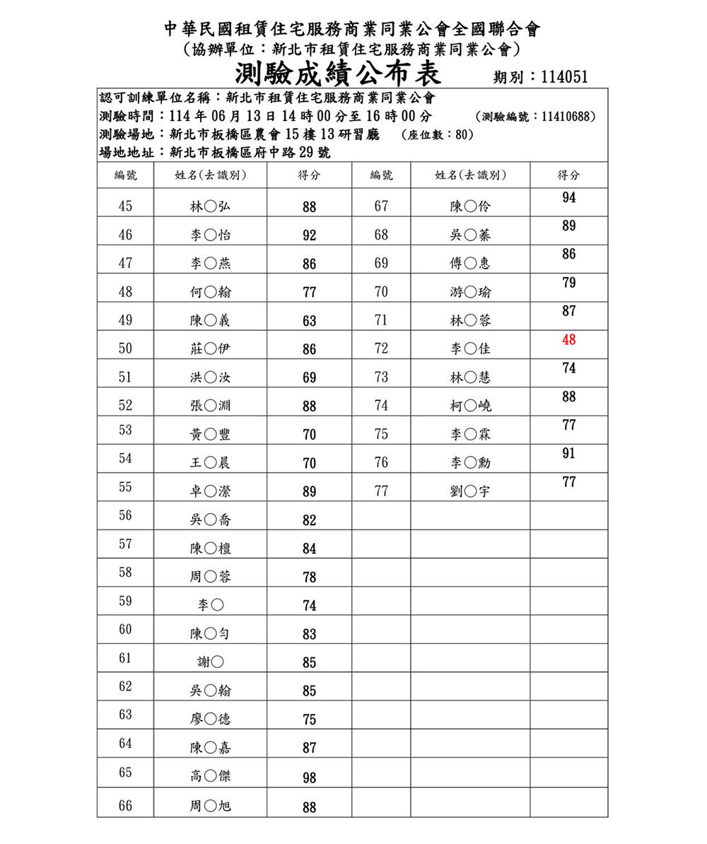 (新訓二班)114年6月份【租賃住宅管理人員專業訓練班】測驗成績單