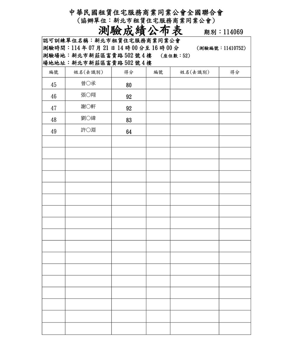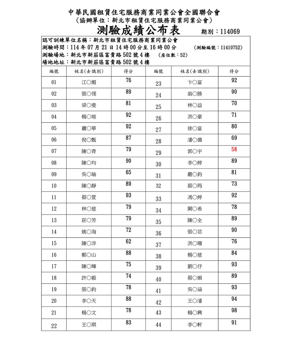 (新訓二班)114年7月份【租賃住宅管理人員專業訓練班】測驗成績單