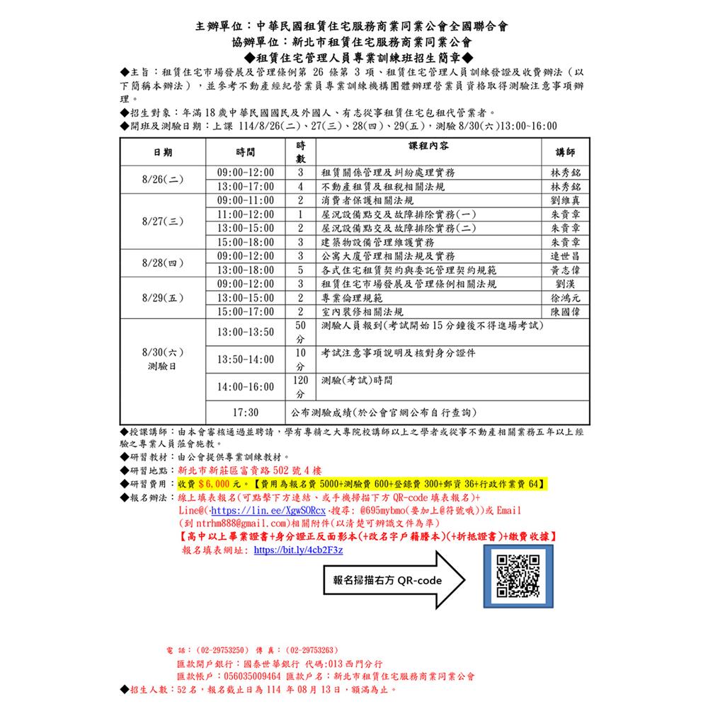 (新訓三班)114年8月份【租賃住宅管理人員專業訓練班】報名簡章