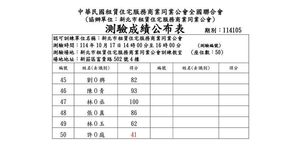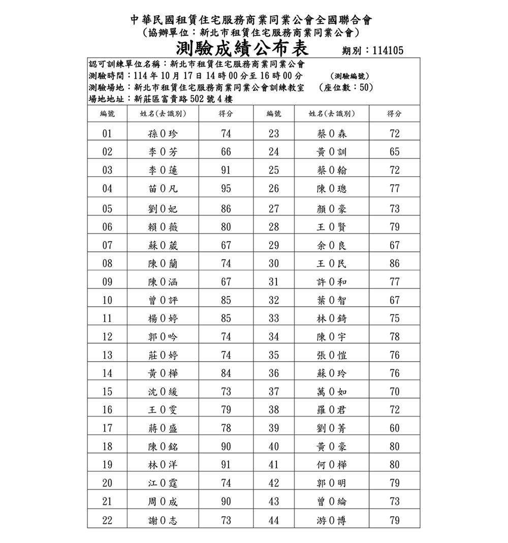 (新訓一班)114年10月份【租賃住宅管理人員專業訓練班】測驗成績單