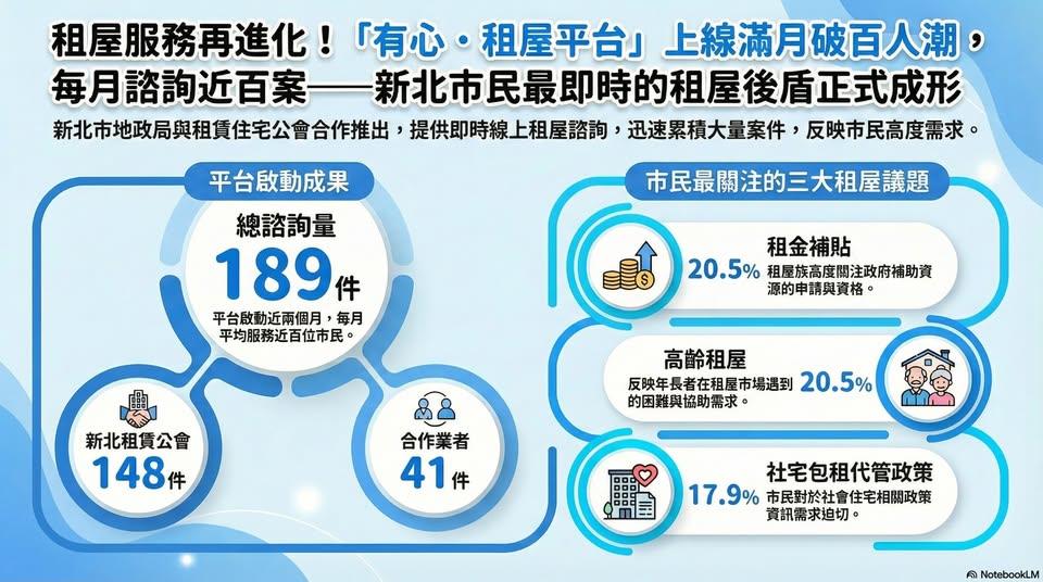 新北市地政局與新北租賃公會攜手合作,自 114 年 10 月 27 日正式啟動「有心.租屋平台」,至今已近兩個月,目前已快速成為市民最即時、最信賴的線上租屋諮詢服務窗口。