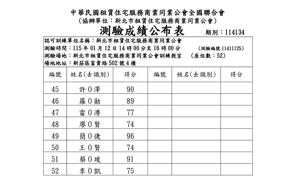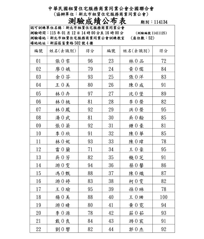 (新訓一A班)115年1月份【租賃住宅管理人員專業訓練班】測驗成績單