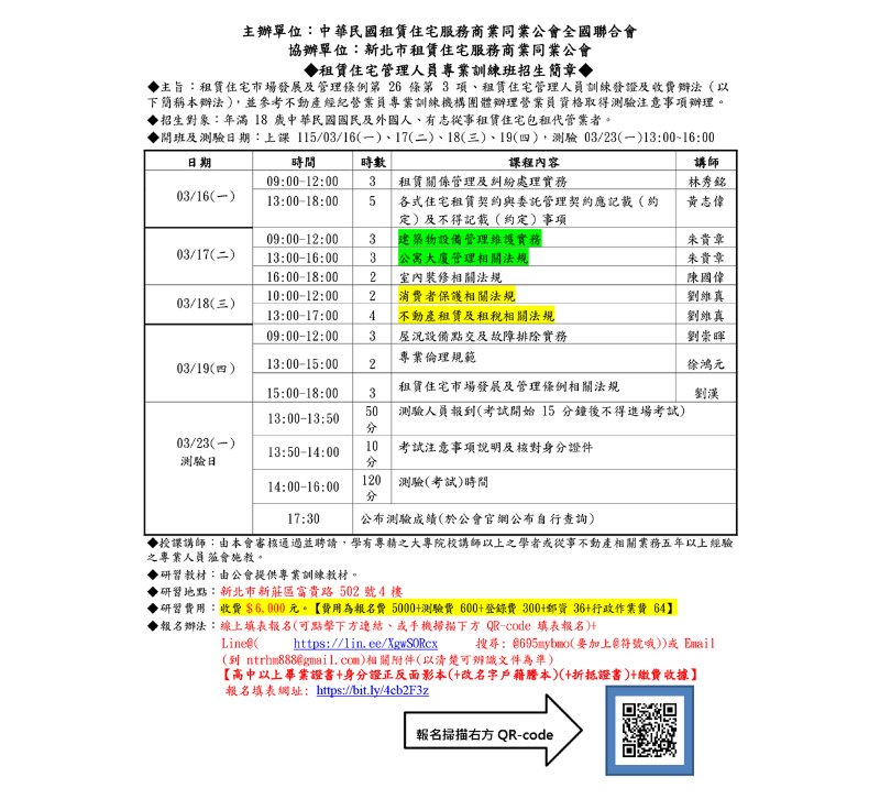 (新訓二班)115年03月份【租賃住宅管理人員專業訓練班】報名簡章