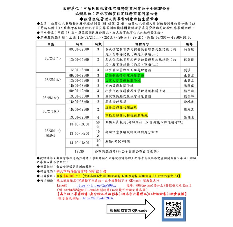 (新訓三班)115年03月份【租賃住宅管理人員專業訓練班】報名簡章