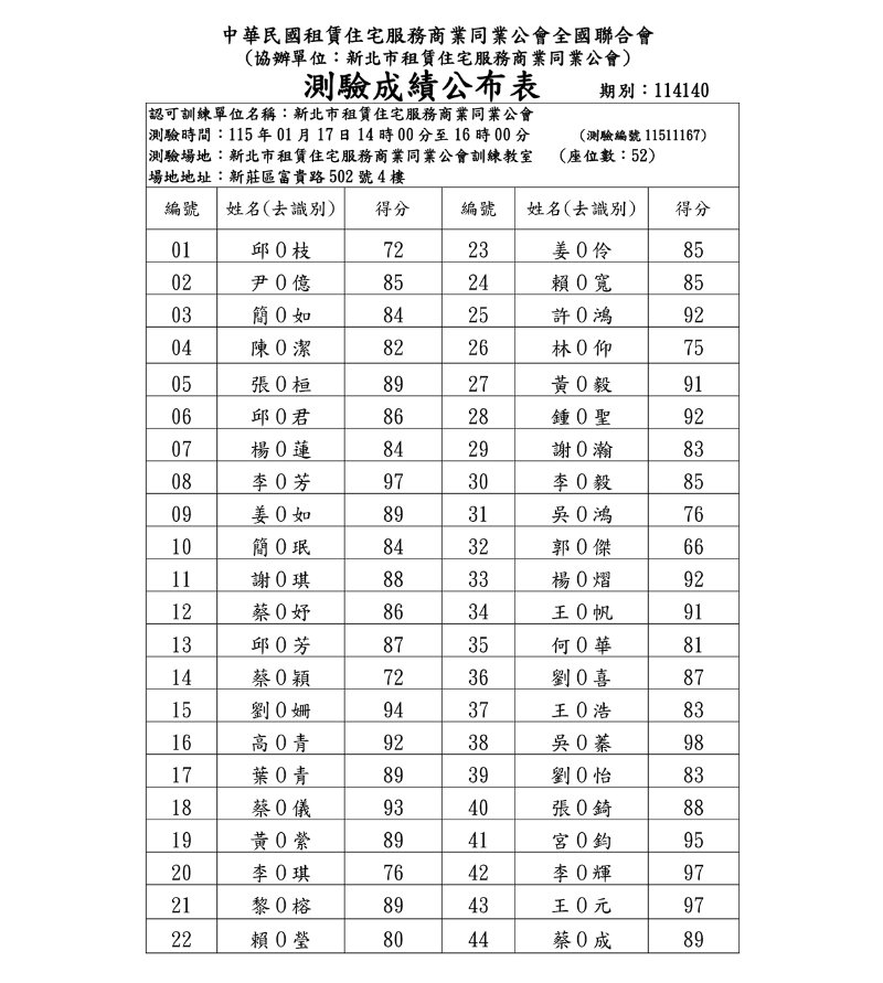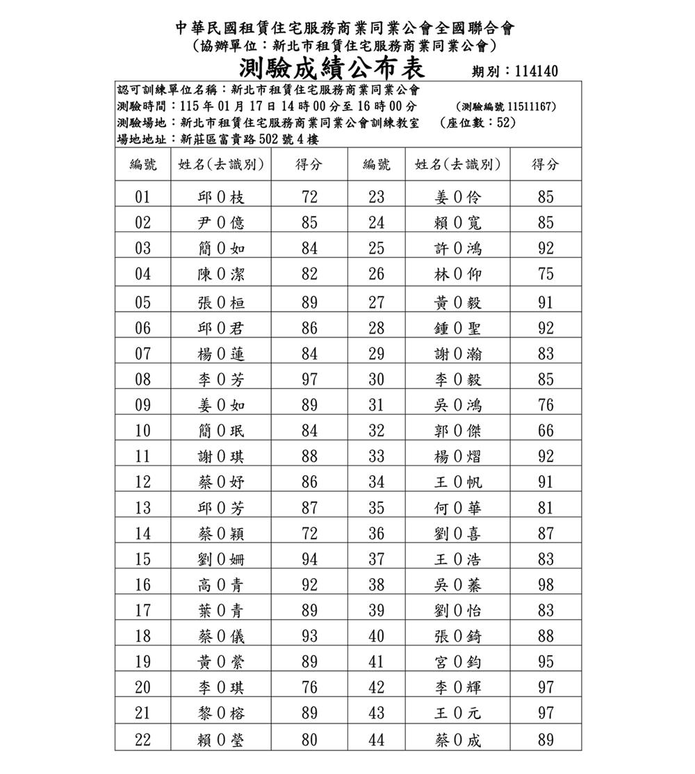 (假日班)115年1月份【租賃住宅管理人員專業訓練班】測驗成績單