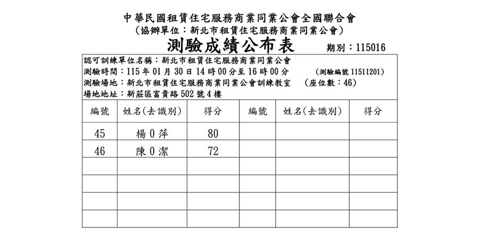 (新訓三班)115年1月份【租賃住宅管理人員專業訓練班】測驗成績單