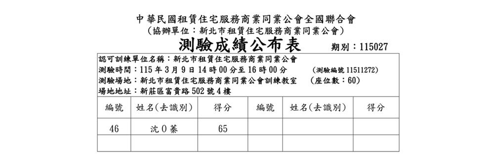 (新訓一班)115年3月份【租賃住宅管理人員專業訓練班】測驗成績單