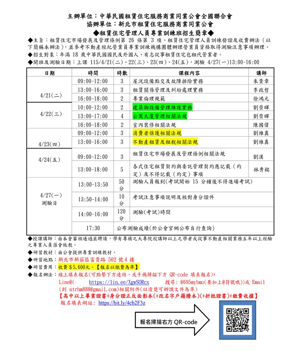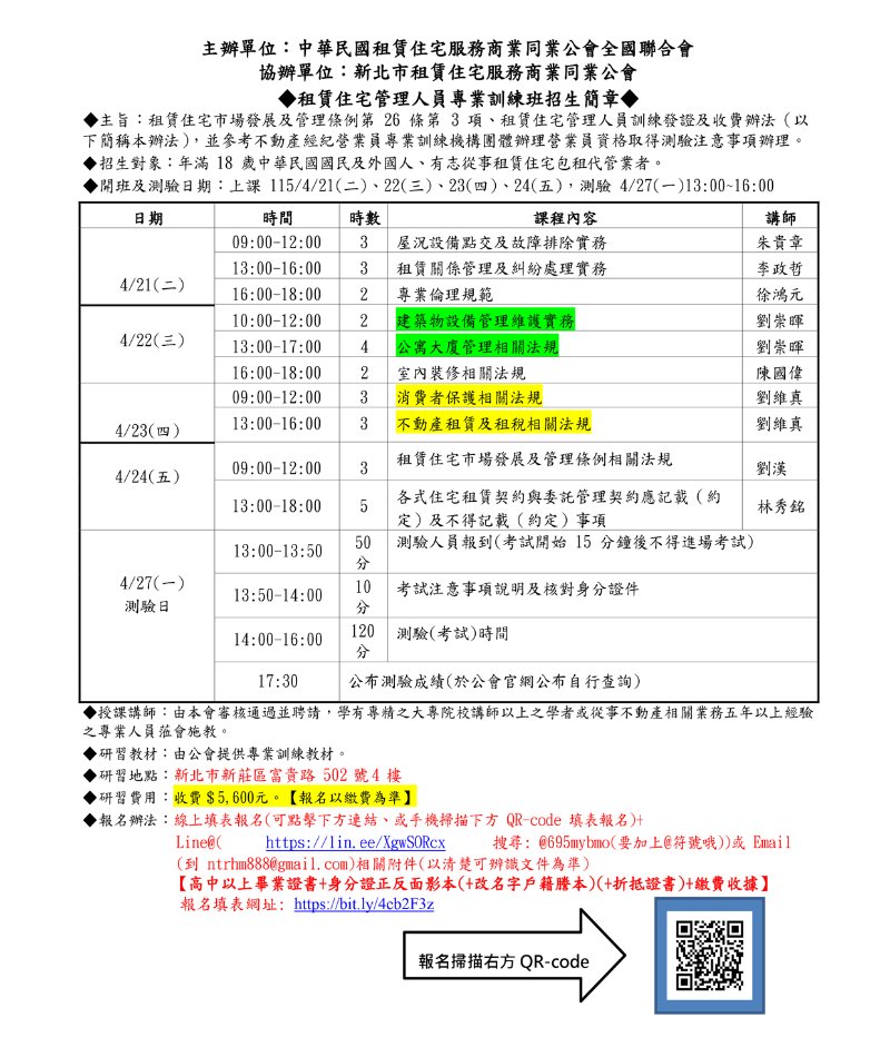 (新訓三班)115年04月份【租賃住宅管理人員專業訓練班】報名簡章