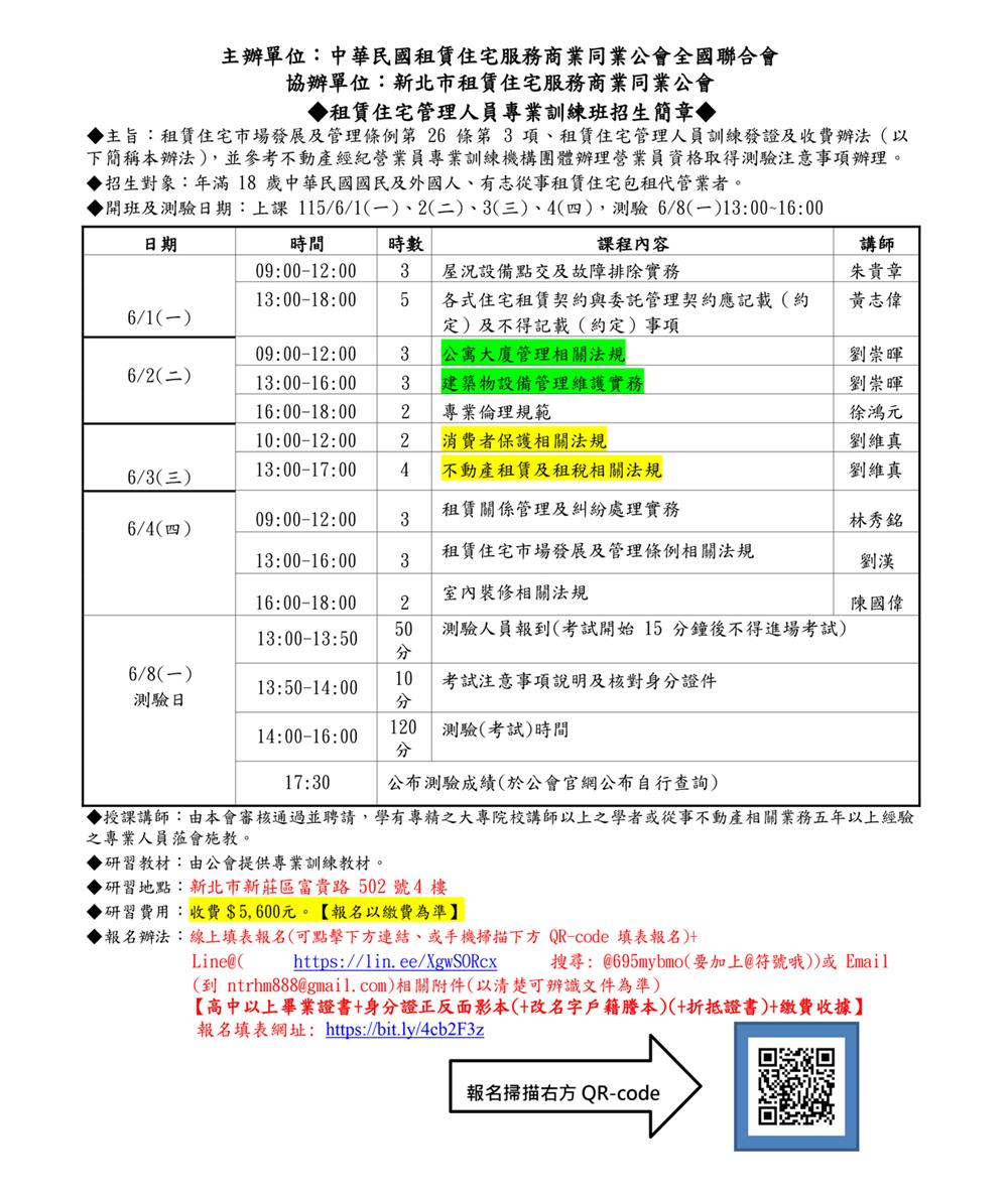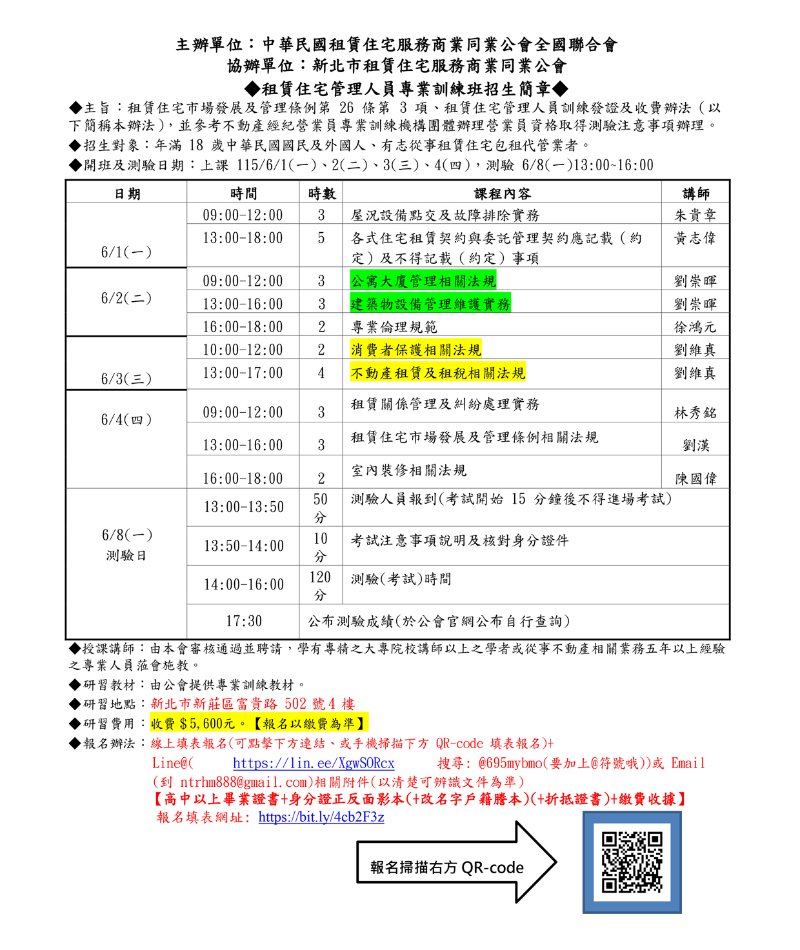 (新訓一班)115年06月份【租賃住宅管理人員專業訓練班】報名簡章