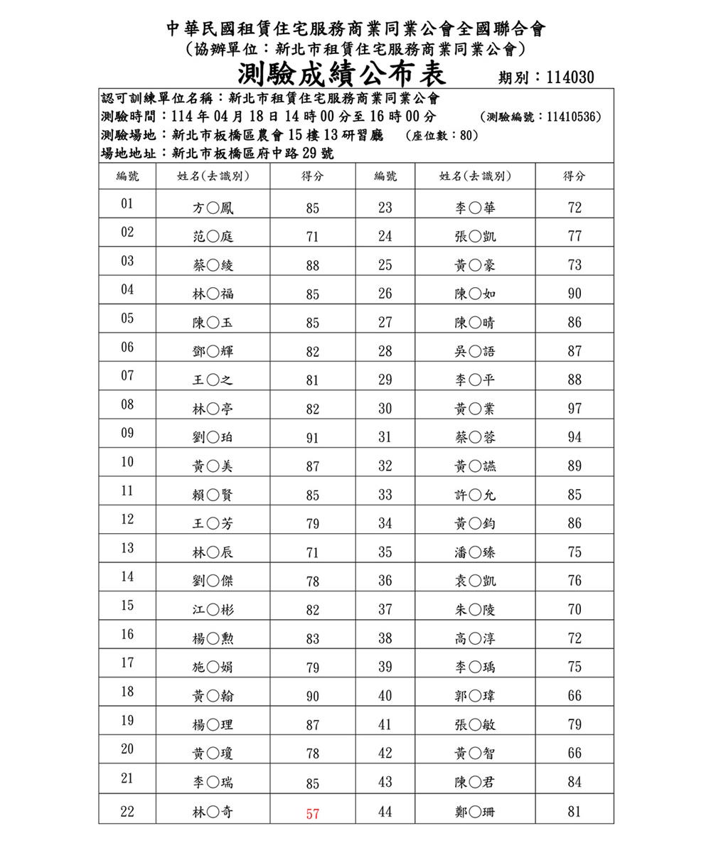 (新訓二班)114年4月份【租賃住宅管理人員專業訓練班】測驗成績單