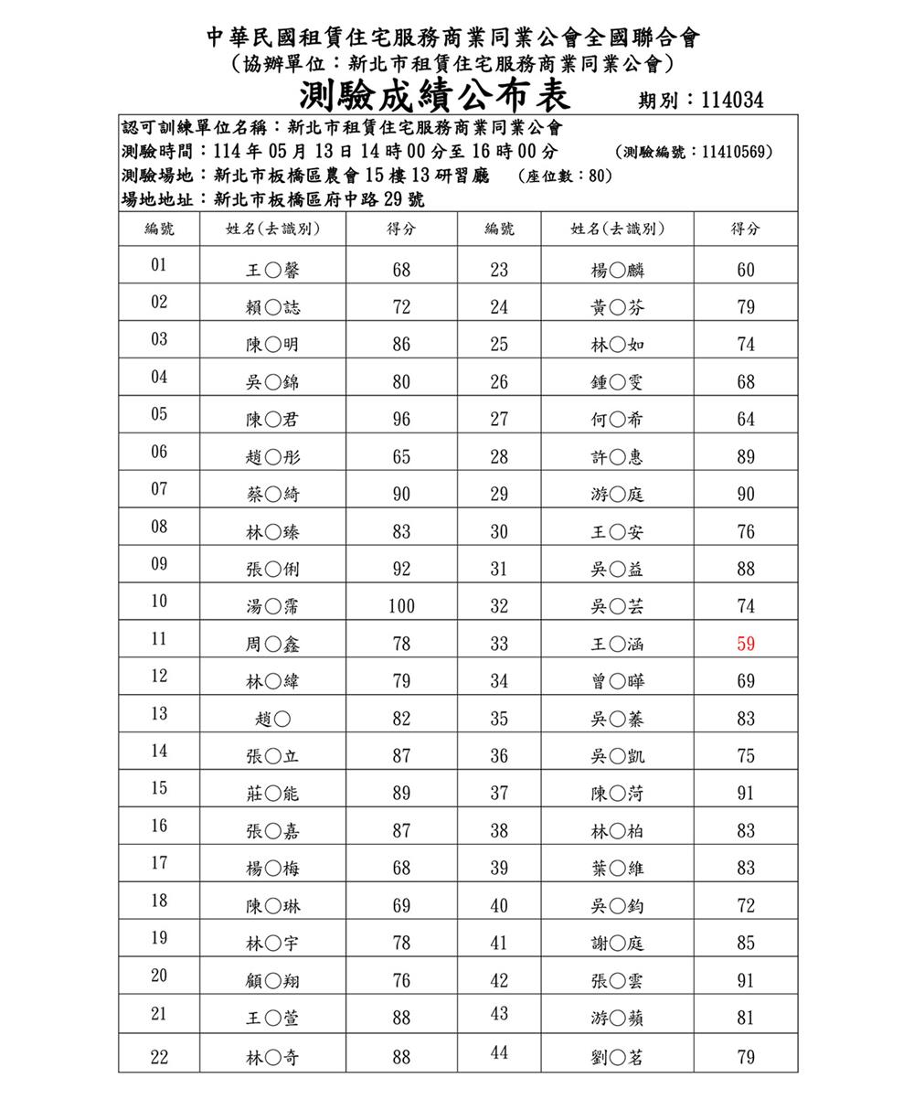 (新訓)114年5月份【租賃住宅管理人員專業訓練班】測驗成績單